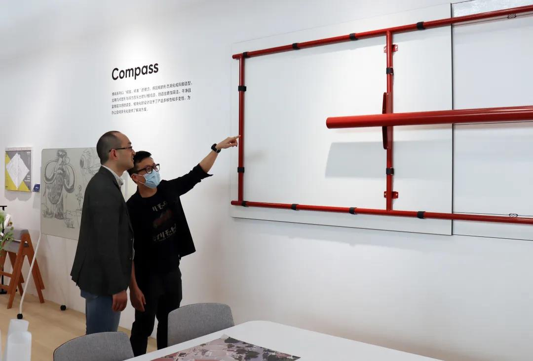 前厅放置极具设计感的得力博肯职员系列,其具有灵活以及多样组合排列形式。并且将产品的零构件进行切割上墙展示,起到装饰作用。